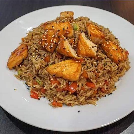 Yakimeshi: Arroz largo fino, morrón rojo, zanahoria, cebolla, chaucha, zucchini